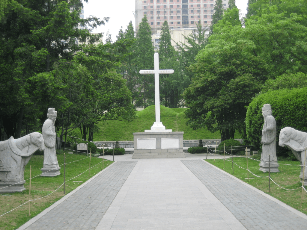 Arriving at Xujiahui Station, there was a long walk through an underground tunnel before the park is reached. There were hardly any people at Guangqi Park. Past the vase-shaped entrance and the quaint stone bridge crossing a small stream, the park’s vegetation exhibited a brambly and almost wild characteristic. It was a far cry from the celebrated Yu Gardens in Shanghai Old City, where everything was meticulously cared for, complete with strategically positioned pavilions, covered walkways and grand halls. However, it became immediately obvious that this park was not a standard Chinese garden. One’s attention was quickly drawn to a spirit way lined by stone animals leading towards a green mound guarded by a large white cross with both Chinese and Latin inscriptions. This was the resting place of Xu Guangqi, the Ming dynasty polymath and one of the first Catholic converts in China.