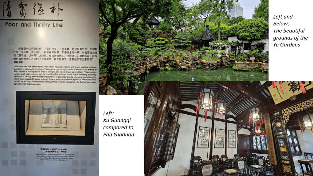 Despite these omissions, the museum made it very clear that Xu Guangqi left an impeccable legacy of righteousness and high moral standing. His humble and austere living conditions were contrasted with the lavish lifestyle of his contemporary Pan Yunduan, the original commissioner of the Yu Gardens, the expense of which eventually led to his family’s downfall. While Xu Guangqi was nicknamed as “One Corner” (Xu Yijiao) and Pan Yunduan as “Half a City” (Pan Bancheng), the former now has a cherished legacy as an important and beloved individual with an entire district in Shanghai bearing his namesake (Xujiahui), while the latter is mostly forgotten although his gardens still attract roving crowds of tourists to enjoy the fleeting pleasures of life.