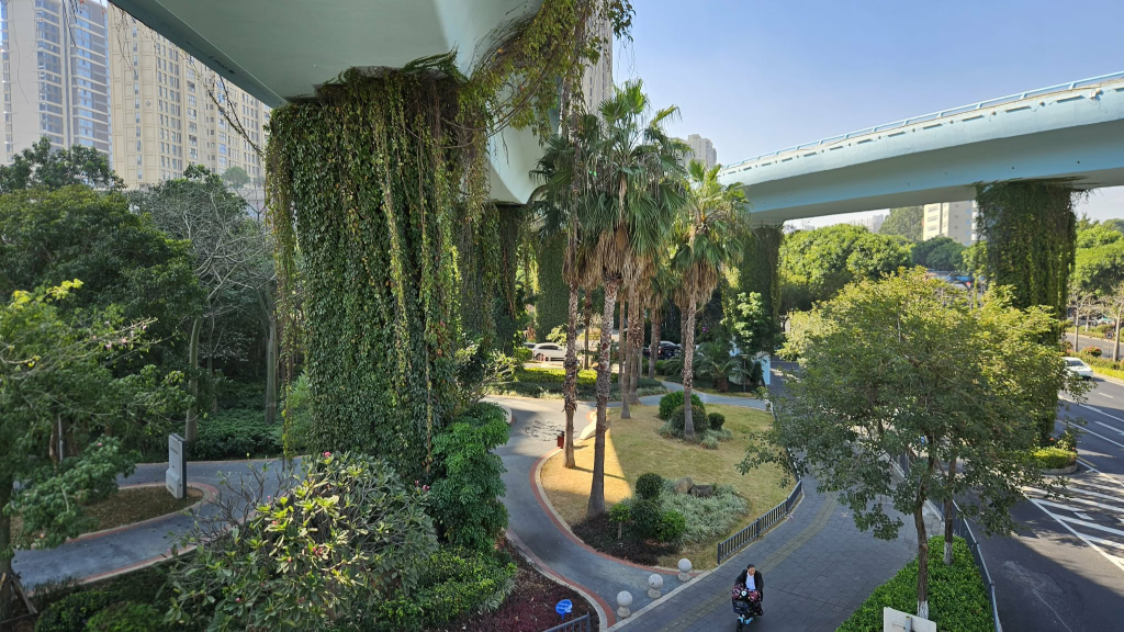 There are numerous entry and exit points on this trail. Every entry and exit location can be found on the trail’s mini-program in the WeChat app. Some are close to train stations; others are harder to get to. I entered the Forest-Sea trail via the entry point at Caitang Station. At this site, the trail is following the BRT line that hangs directly overhead, providing the walkway with fair amounts of shade from the afternoon sun. Half of the trail is dedicated for cyclists but the cyclist and pedestrian lanes are conveniently marked and separated by barriers. The concrete pillars and the underside of the BRT line are covered in luxuriant leaves, roots, and occasionally flowers. This is not a popular part of the trail so there were hardly any other people here. The path crosses over traffic intersections and passes by a large school with proverbs written on its whitewashed walls as it heads towards the viridian Dongping mountain ahead.