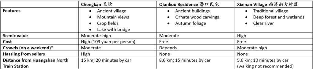 I hope that this article will assist those who are planning to explore Huizhou on their own. A rough summary, based on my personal opinion and biases, are laid out below in a table. Please note that I visited these sites on a weekend in late autumn (end of November).