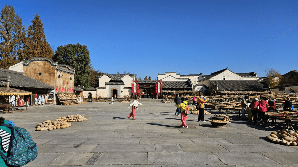 As per the map, there is a well-defined tourist route. At the entrance (the south gate), there is a large paved square. Because it was late November, there were many crops being laid out to dry in preparation for winter. This was a very popular spot for photography. Passing this, there are some traditional Huizhou buildings which house a museum of a sort, explaining trigrams, the Book of Changes, and the significance of the village layout. Unfortunately, most of it is in Chinese.