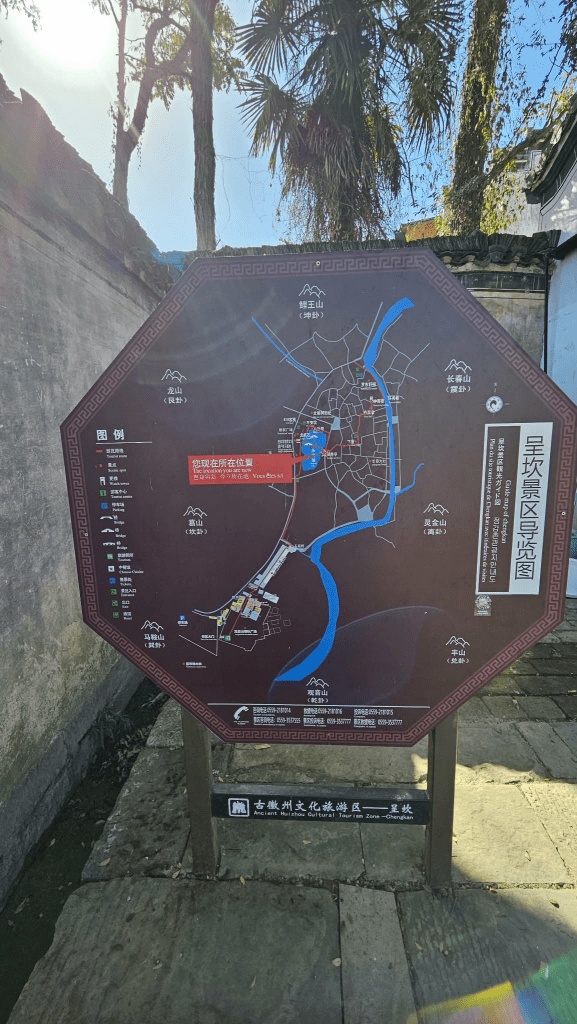 Chengkan Village is widely praised for being one of the most beautiful Huizhou ancient villages, a reputation that can be traced back even to Su Dongpo in the Song Dynasty. Its fame lies in its design that follows feng-shui principles, supposedly imitating the yin-yang symbol. Looking at the map though, it is a challenge to see the resemblance unless one uses his imagination as well. I hoped Chengkan would be less crowded than other ancient villages, given its location and high ticket cost. While my research did indicate that the ticket cost would be 109 yuan per person, we were charged only 53 yuan per person, to my pleasant surprise. I am not sure if this was because we were foreigners or if there was a discount at the time.