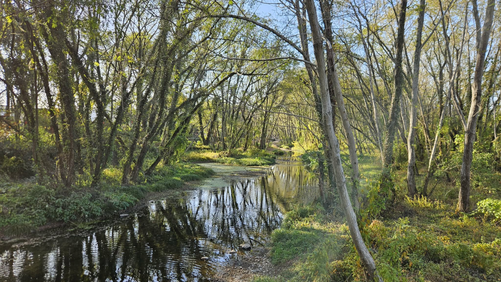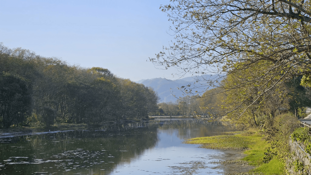 After crossing the river, the scenery only becomes more magical. The forest becomes thicker and several clear, slowly flowing brooks with moss-covered banks come into view. The trees reflect themselves in a swirl of yellow, brown, and green, with fragments of sky-blue peeping in between. When I visited, there was a raft that floated gently on the brook, offering an opportunity to experience tea in a floating teahouse.