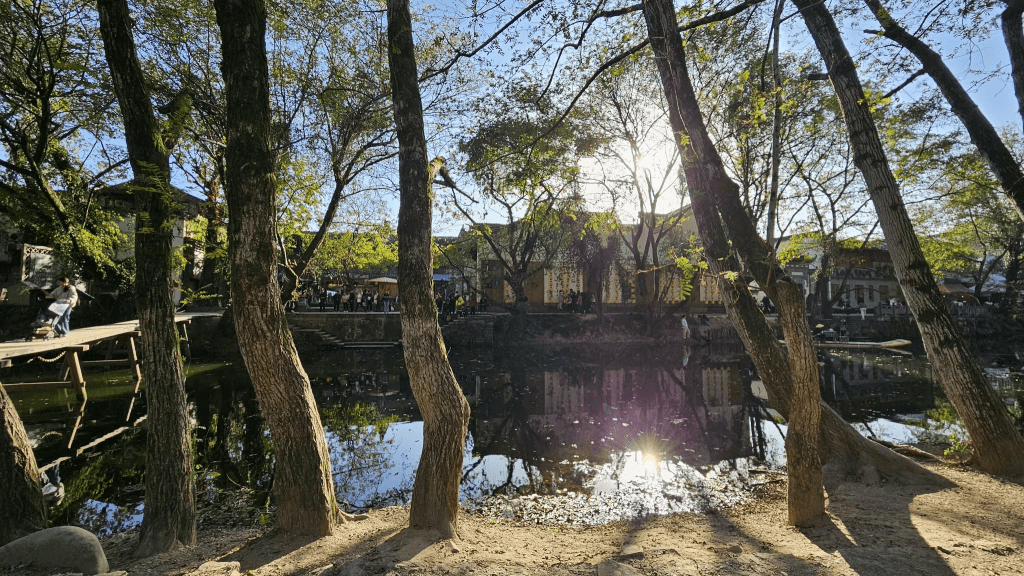 Although Xixinan Village was crowded, likely because it was free, the beauty of its scenery made it highly worthwhile to visit. At the northern entrance, there is a long flat bridge that crosses a lovely river sparkling in the sunlight, flanked with tall, ancient trees. Mountains are seen in the distance. The scene resembles an oil painting by an Impressionist master, as the faraway leaves glisten yellow under the evening sun.